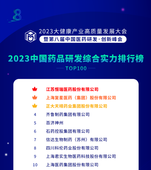 由药智网、中国药业杂志社主办的2023大健康产业高质量发展大会暨第八届中国医药研发•创新峰会于6月16日开幕,会上发布了《2023中国药品研发实力排行榜》系列榜单,AG百家乐医药凭借深厚的创新研发实力再创辉煌:荣登《2023中国药品研发综合实力排行榜TOP100》榜首、《2023中国化药研发实力排行榜TOP100》榜首。值得一提的是,今年是AG百家乐医药连续第6年入选《中国药品研发综合实力排行榜》榜首。